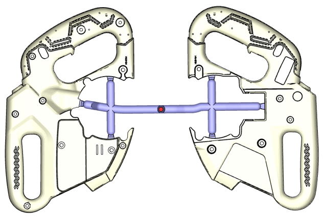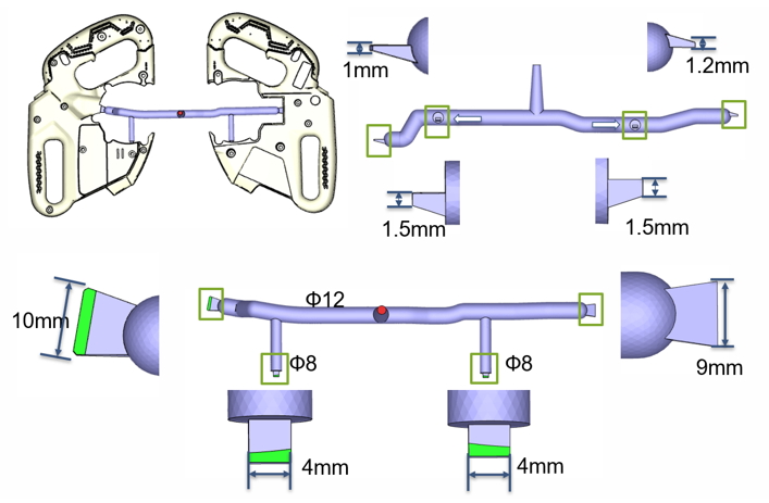 接着便可根据模拟结果来修正流道尺寸及优化制程参数,以找到最适合的解决方案。好景团队藉由经验与 Moldex3D 工具,对模具设计做了优化,在优化设计中,主要模具变更以流道为主,除了减少两条分流道(左右各一),还缩小分流道及浇口尺寸,如图五所示。