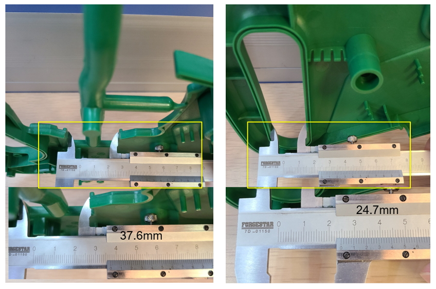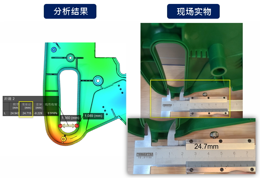 最终,从翘曲模拟结果上,好景团队实际变更模具设计后,进行关键位置尺寸之确认,结果显示原始设计与变更设计差异不大(图九),符合客户所需,而在实际验证后,也能得出相符结果(图十)。