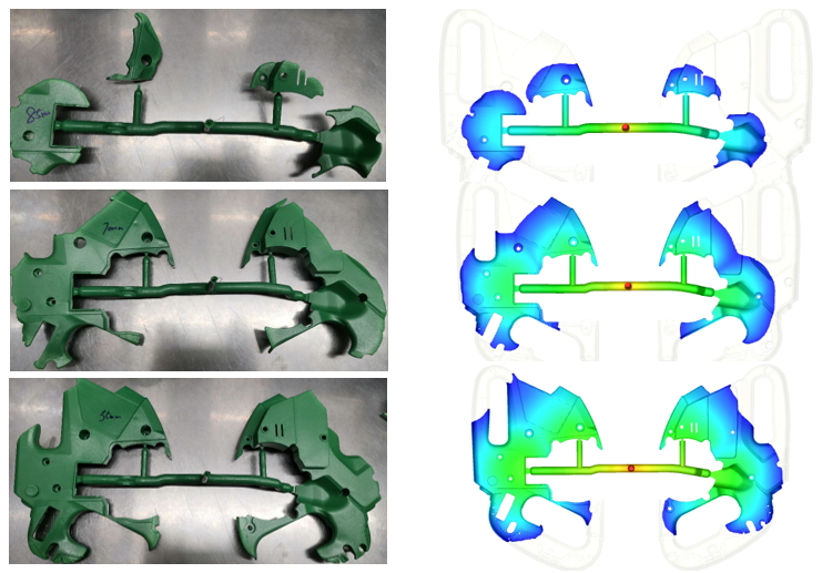 好景团队首先利用 Moldex3D 进行模拟准确度验证,图二为流动波前之模拟结果,可清楚看到模流分析结果与现场实物具有高度相似。