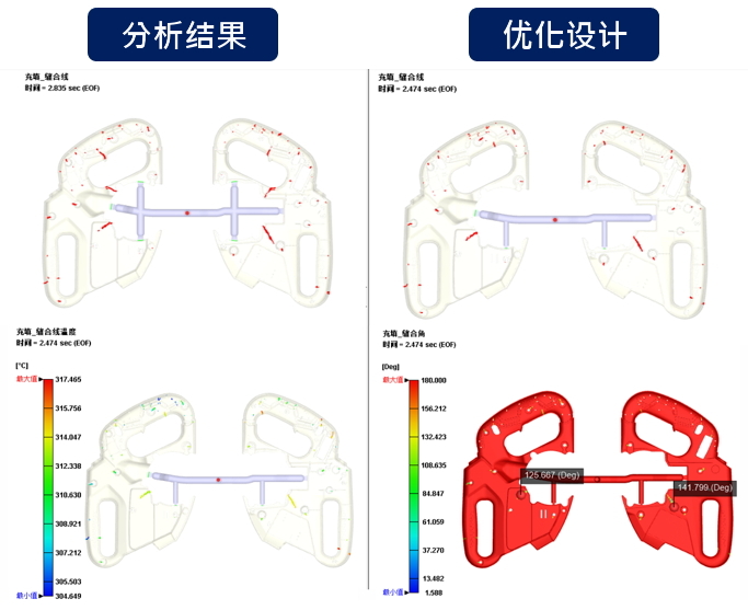 研究进一步比对原始设计与优化设计之模拟结果。由图六可以发现,相较原始设计,优化设计除了缝合线数量明显下降外,在缝合线温度 (312℃) 与缝合角 (125℃-141℃) 均有较佳的表现,材料加工温度设定为 305℃,因此可判定该缝合线所造成的外观及强度风险较低。