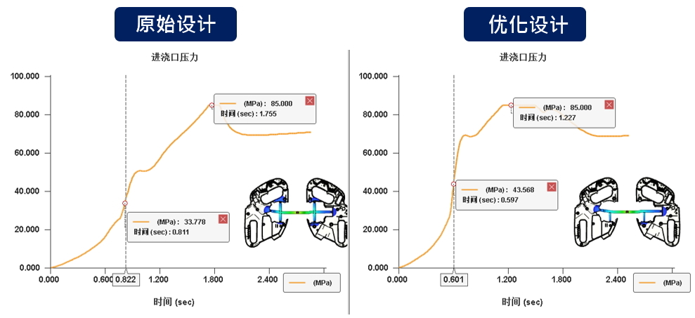 在观察重点压力损失的比较上,如图七所示,原始设计的浇口压力损失为 33.8 Mpa,而优化设计的浇口压力损失为 43.6 MPa,在现场的成型条件之下,两种设计的射压最大值都到达了射压的上限值;在无法维持设定射速的情况下,产品仍能打满,因此变更设计可适当降低射出速度。