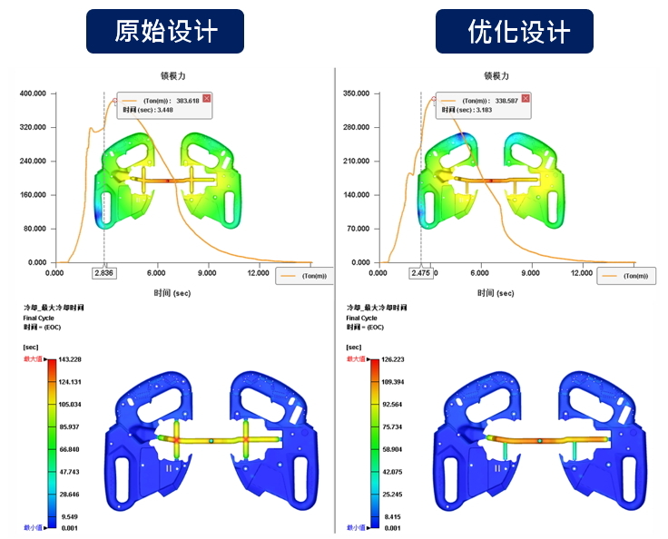 在锁模力的比对上,如图八所示,原始设计的最大锁模力为 383 Ton,经过设计变更后,最大锁模力为 338 Ton,相比原始设计降低 45 Ton;此外,整个成型周期也由原先的 14.3 sec 降至 12.6 sec。