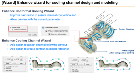 - 冷却水路精灵强化:水路支持贴近塑件,并可输出轮廓线提供水路调整