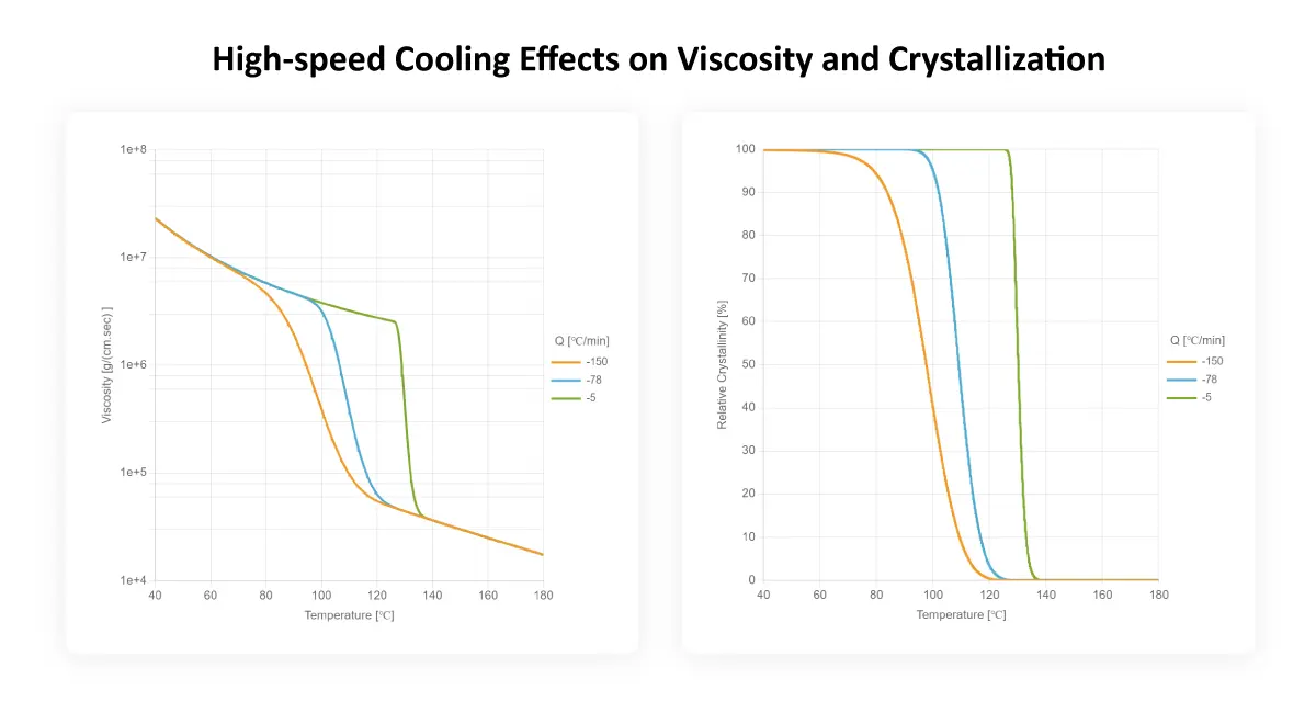 藉由 Dual Nakamura Model,Moldex3D 能同时考虑一次与二次结晶、压力效应,新版本中结合 Moldex3D 材料实验室特有的高速冷却量测数据,让仿真更接近真实加工状态。工程师可以更准确预测结晶度、流变与尺寸变化,缩短试模时间,提升产品一致性。